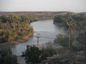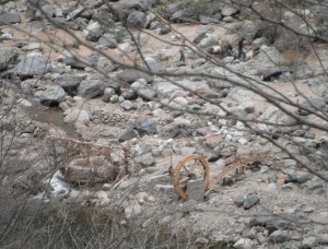 We wandered around a little bit more and then returned to Batopilas. We spent the afternoon mostly people-watching from the porch of our hotel, which looked out over the river and had a nice view of a dozen or more homes on the steep bank on the other side. The homes were small, so the families did much of their real living outside. It appears that most families have 5 or 6 children. We watched the children in a couple of families caring for their younger siblings and doing other chores. One little boy, perhaps 3 years old, spent most of the evening chasing a particular chicken in their yard, and when he caught it he picked it up, carried it around proudly for a few minutes, then set it down and started chasing it again. We watched a few women washing their laundry in the river and setting it out to dry on rocks alongside. We saw men working on building a new home with adobe bricks, and a few families moving around perhaps returning home from a visit to a relative or on their way to a friend’s home. We enjoyed a little show when a calf ran down the river and a middle-aged man was chasing him. Later the man returned with a lasso, but the calf crossed the river and the man was slowed down. After the calf turned into town, we lost sight of them and never saw the resolution to this conflict. As dusk set in, we left for dinner and an early bedtime – the bus back to Creel left at 5am!