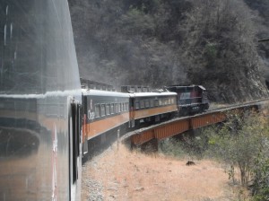 The bus was a similar van to the one that we’d taken down the canyon, with a different driver. Both drivers were very experienced and competent, so we knew we were safe even though Dan was extremely uncomfortable with the environment. Fortunately (?) it was pitch dark when we left, so there wasn’t much to see for the first 2 hours. By the time it was light enough to see, we were almost past the unpaved section and Dan’s worst fears. At one point along this road, an old man and woman walked down onto the road, appearing from seemingly nowhere, somewhere up in the mountains. Each of them was carrying a large sack, probably 40 or 50 pounds. They hailed the bus, and we stopped to pick them up. They put their big sacks on the roof and the man got in the bus – but not the woman. She turned around and headed back up the mountain where she’d come from. Although it was clear that they were a couple, there was no sign of affection between them: no good-bye kiss or hug, no gentle words. Another demonstration of their reserved nature. Both people were dressed in traditional attire, the woman in a very ruffled skirt and pleated blouse, and the man in a similar blouse with a characteristic skirt-like loin-cloth and a cap. He had a friendly demeanor while he was on the bus, but only briefly talked with one other person on the ‘bus’, another indigenous man.