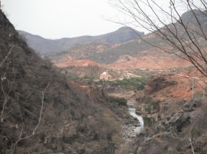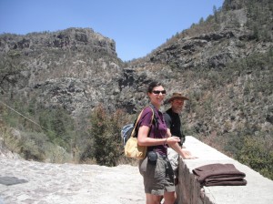 Once we arrived in town, we found a hotel and explored the town a bit. It felt good to stretch our legs! Batopilas was founded in the heyday of the silver mining in the region a century ago. Because of all the wealth, it was the second city in all of Mexico to have electricity. Currently there is no mining going on (although exploration is starting up again, as the price of silver as risen in recent years), and the town is pretty sleepy. Although it is no stranger to tourism, there are far fewer Western faces seen here than up in Creel. We walked to the outskirts of town and wandered around an old hacienda which had been used during the mining boom. Now it’s just a red-brick ruin with hints of the beautiful architecture here and there: arches that once formed doors and walls with a string of elegant but long empty windows overlooking the river. There’s a swinging bridge across the river, a long foot-bridge linking the two sides of town. Our hostess told us that there were two restaurants in town that she would recommend, that she liked equally well. We had dinner at Dona Mita’s the first night and Casa Carolina the second. Both were indeed charming, affordable and delicious. Dona Mita recited the menu to us, of the 4 or 5 things she could cook for us today. Carolina’s was a room of her house, and the first time we entered we ended up in her living room instead of the public eating room. We found the food in Creel uninspired, but thoroughly enjoyed our dining experience in Batopilas.