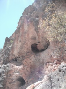 The first day in Creel we rented bicycles and visited several of the “must-see” places near the town. There’s a valley nearby which is filled with huge pillars of rock. Historically the place was called the Valley of the Gods, but it was renamed the Valley of the Monks (Valle de los Monjes) when the Spaniards came on the scene. We stashed the bicycles and hiked in a little ways, but our itinerary was a loop so we didn’t stay long. Although we were a bit uncertain about the route, the trail was always easy to spot and we never took a wrong turn. We continued down to a local reservoir which offers fishing, camping, boating and a little bit of swimming. We stopped for a picnic lunch, and actually dozed off for a short while before we started to hear some distant thunder. We decided not to chance getting caught in a storm, so we headed on back. By this time, we were all saddle-weary; the bicycle seats were quite hard and we were ready to be back. Much to our relief, the last 5 km of our loop tour were on a paved road. Just on the outskirts of the town, we passed a big cave, which was clearly still occupied by an indigenous family. The Tarahumara people were the original inhabitants of this area, and they live very close to the land. They traditionally lived in caves and walked very long distances regularly. They do not seem to live in tight communities, but rather are quite independent and reserved people. Many of them now have built houses from the sorts of materials we Westerners would assume. It appears that many of them have built houses right near their cave, as sort of an extension to increase the size of their living quarters. This particular cave seemed to have the kitchen still in the cave, with perhaps a bedroom in a nearby house. The laundry was strung from somewhere in the cave to a tree outside.