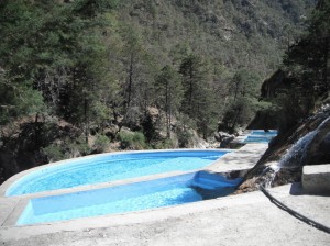 The second day in Creel none of us felt like riding another bike! We paid our host (the hotel owner offered up his cousin to be our tour guide) to take us to a nearby hot springs. The first hour was by car and the last hour by foot down a cobblestone road which descended 1500 feet in about 3 miles. The driver is Mestizo, of mixed Spanish and indigenous race, and he’s interested in the Tarahumara people. (Tarahumara is the name given them by outsiders. They call themselves the Raramuri, which translates in their language to “people who run”.) He taught us to say “hello” and “what is your name?” in Raramuri (but it was difficult and we no longer remember either!). The only other visitors were a young Mexican family, playing in one of the pools when we arrived. Later we talked with them and tossed a ball with the 5-year-old son. The walk to the top afterwards was challenging but the scenery was still spectacular as the shadows deepened into dusk.