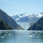 Our first day’s experience with icebergs was amazing. We spent a full day in the Tracy Inlet, visiting both of the forks at its head (cleverly named North Tracy Arm & South Tracy Arm). This inlet is roughly 25 miles long and was carved out by the Sawyer glacier. It’s very deep, with nowhere shallow enough (or protected enough from floating ice) to anchor, so we spent the night before in a largish cove at the mouth and got up early to spend the entire day motoring up to the glaciers and back. Between the waterfalls, icebergs & glaciers, the scenery was so spectacular that we were all exhilarated after our day and not at all exhausted like most long days with the engine running.